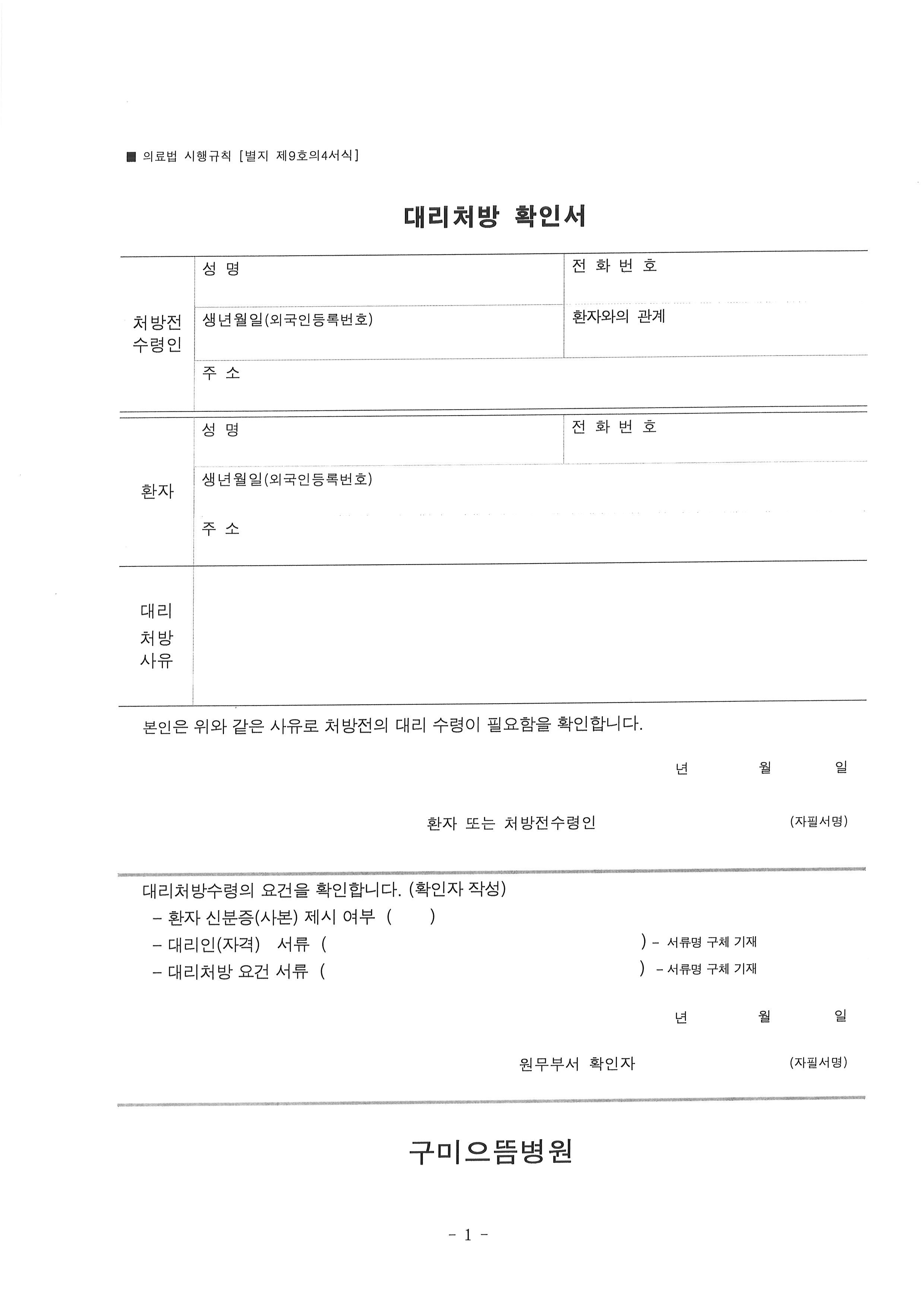 대리처방 확인서 (진료과 작성)