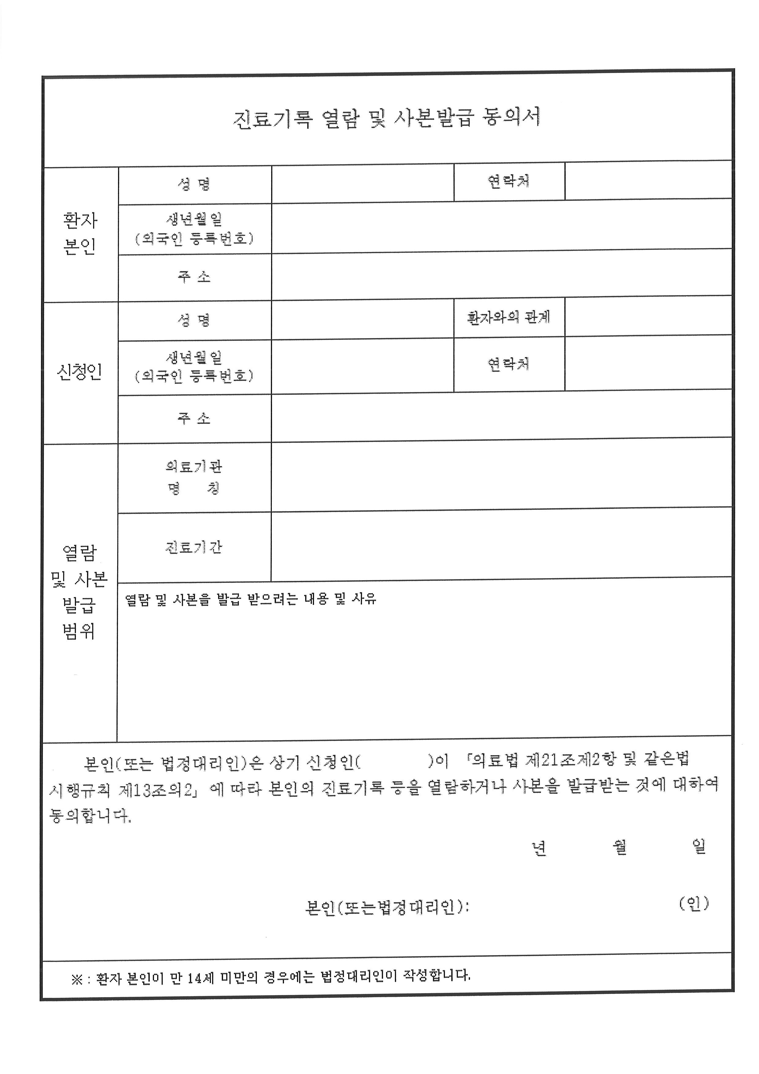 의무기록 사본신청서에 인적사항, 환자와의 관계, 주소, 목적 등을 정확하게 기재한 후,